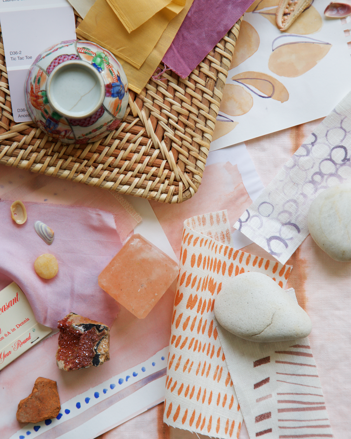 I start by going to my color bins. They’re in a cabinet in my studio, and the bins are filled mostly with hand-painted color standards I’ve made. I don’t use Pantones; I paint my own standards in gouache. It’s something I’ve done since college that helps me specify the precise colors I want, with exactly the right finish and variation and movement. When I’m making them, I play with different versions of the same ideas: lighter, darker, more green, more blue, more saturated, less saturated. I also use the bins to collect bits of inspiration: fabric cuttings, paint and tile and wood finish samples, yarn, paper, scraps of restaurant menus, random magazine tears, and pictures of landscapes and rooms I love.