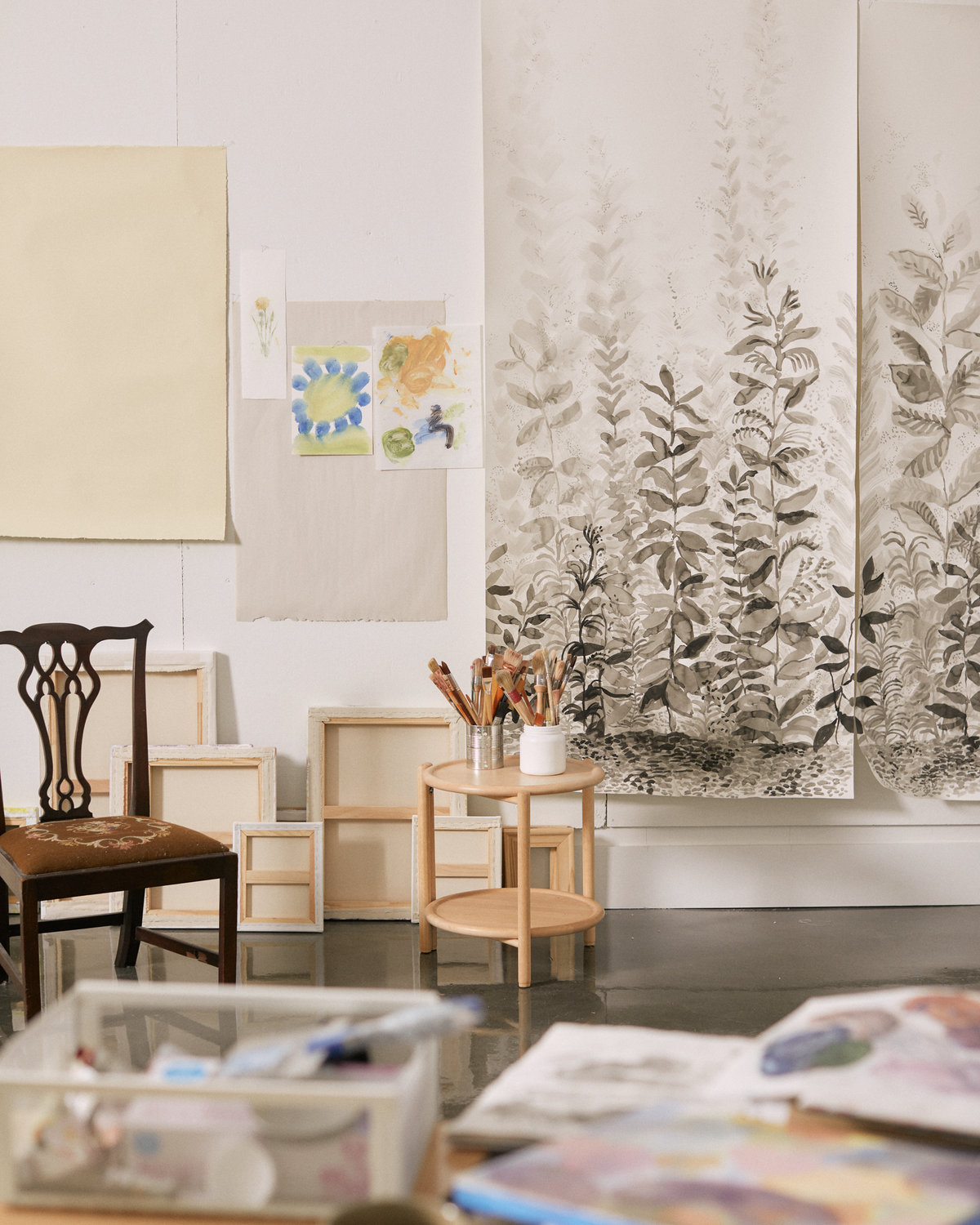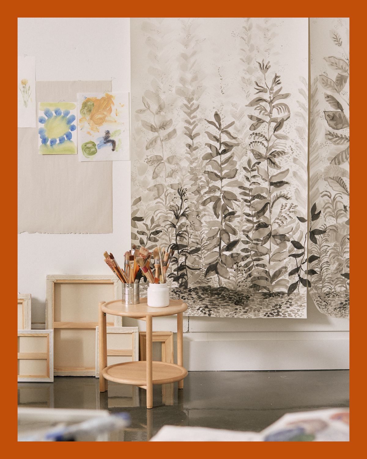 I returned to ink when I first started experimenting with ideas for murals. I was thinking a lot about scale and how to build depth, so it felt natural to pull back on color. I do that sometimes when I want to focus. I actually developed the mural we’re launching this season, Misty Morning, before and then alongside our Hampton Park mural. I painted it at scale on the floor and really leaned into the gestural movements my arms could make leaning over. I liked how the ink pooled in areas as the paper warped slightly despite being taped down.