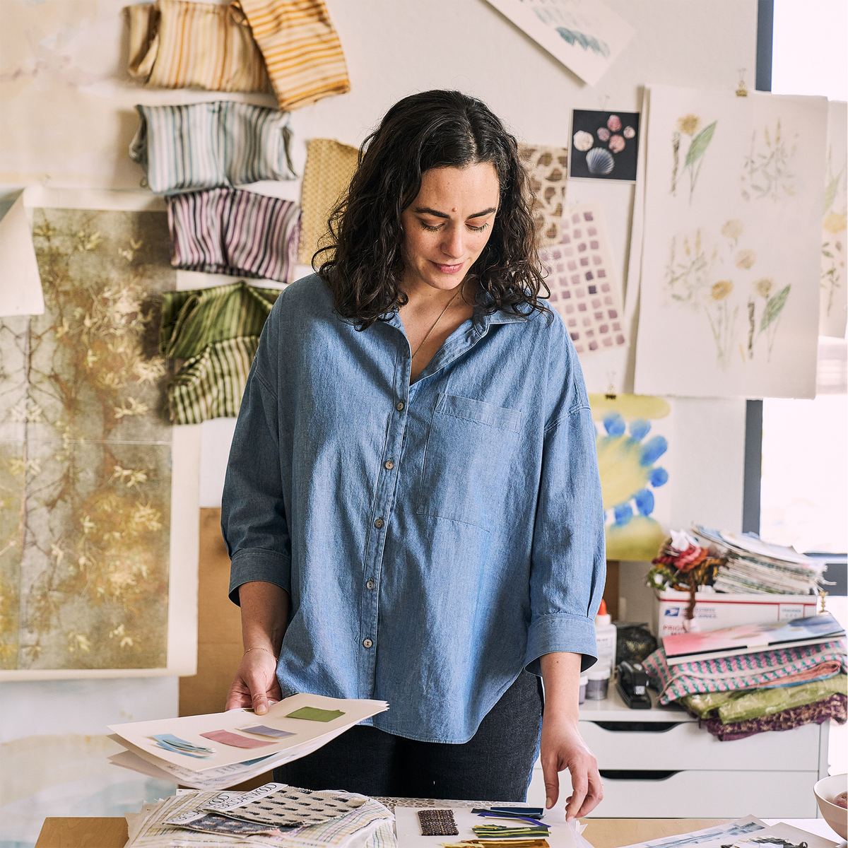 I’m excited about the color explorations we have to share with you this year, starting with some moodier colors in this latest collection as well as our March collection. May will be all about white, and then fall will be a wider mix. In the meantime, I’m excited about the two new patterns we’re introducing now because they’re so helpful for telling a color story. Both are multicolor stripes—one airy, one dense—and although they contain only bands of each of the colors in them, they can inspire the palette for an entire room. Rather than looking graphic, the stripes are prismatic and atmospheric. They make me think of walking quickly through the park so that all the colors blur, or the drips that happen when a painting is drying and the colors blend together. You can pull out your favorite colors and build a space from them. In my own sunroom, I used Picnic fabric in the rainbow colorway for cafe curtains and, to highlight the yellow in it, Stamped Garland wallpaper in Goldenrod. The combination is like sunshine in winter; it looks so happy with the sun filtering in. I can’t wait to hear what you think of them and see how you use them.