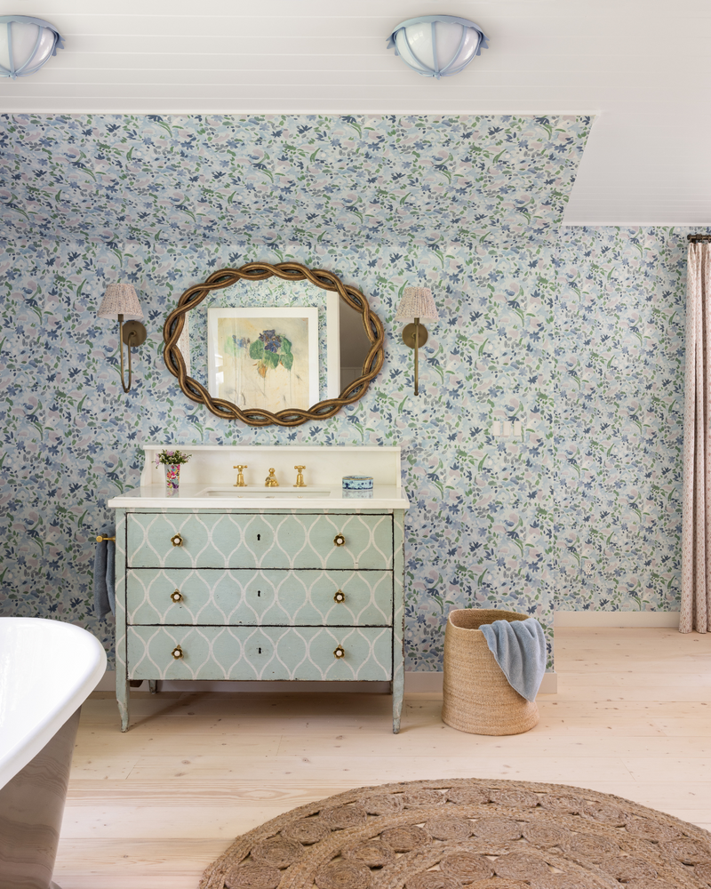 This bathroom feels like an extension of a bedroom—the sink in particular looks like a dresser to me. Tell us more about your approach to this room and your choice to use our Wildflower wallpaper.