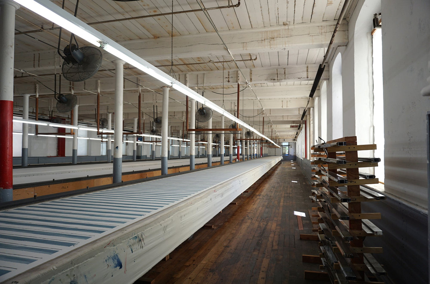Since our first collection, we’ve entrusted a 75-year-old family-owned and -operated mill in Rhode Island to produce our screen prints. They employ a process called table or flatbed printing. The base fabric gets rolled out across a long table, then two people position a large, heavy screen and squeegee on top and press the dye across the screen onto the fabric with their hands. The two printers work their way down the long table, letting the dye dry, then they go back to the top and print in between the repeat. Their uneven hand pressure creates more variation than a machine would throughout the fabric, an effect we love. We sometimes even have them use two slightly different screens to recreate the “bleeding” look of Rebecca’s early printing techniques—our Dashes pattern is one example.