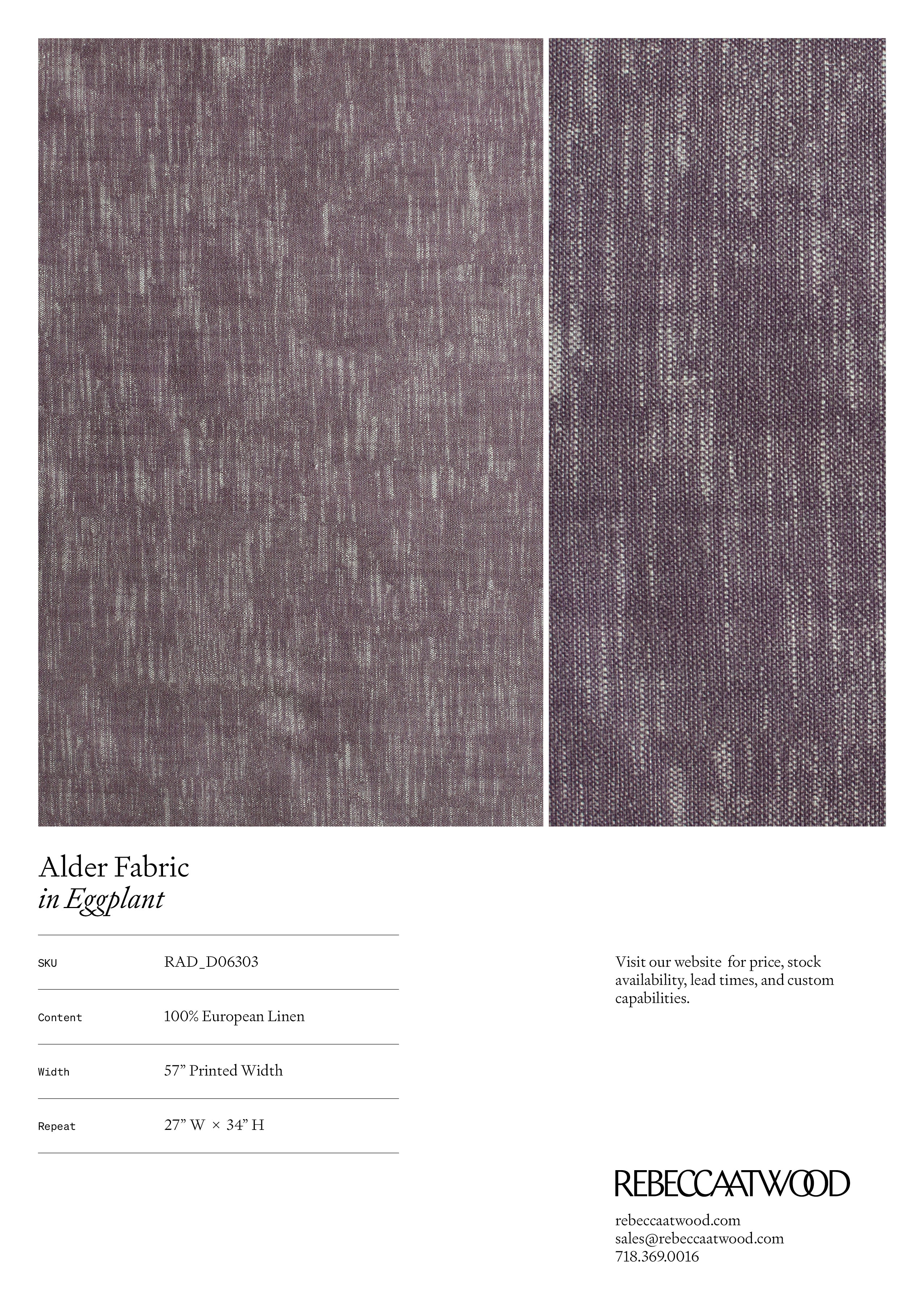 Alder repeats an abstract dripping pattern that reminded Rebecca of the catkins of an alder tree. The single-color print allows the linen ground (ivory or oatmeal, depending on the color) to show through, adding to its textured appearance—almost like a pair of Japanese selvedge jeans. In warm, rich EGGPLANT, it takes on a bark-like texture against the lighter ground. This plummy purple is an alternative neutral that layers nicely with our deep pinks and earthy reds as well as warm woods.